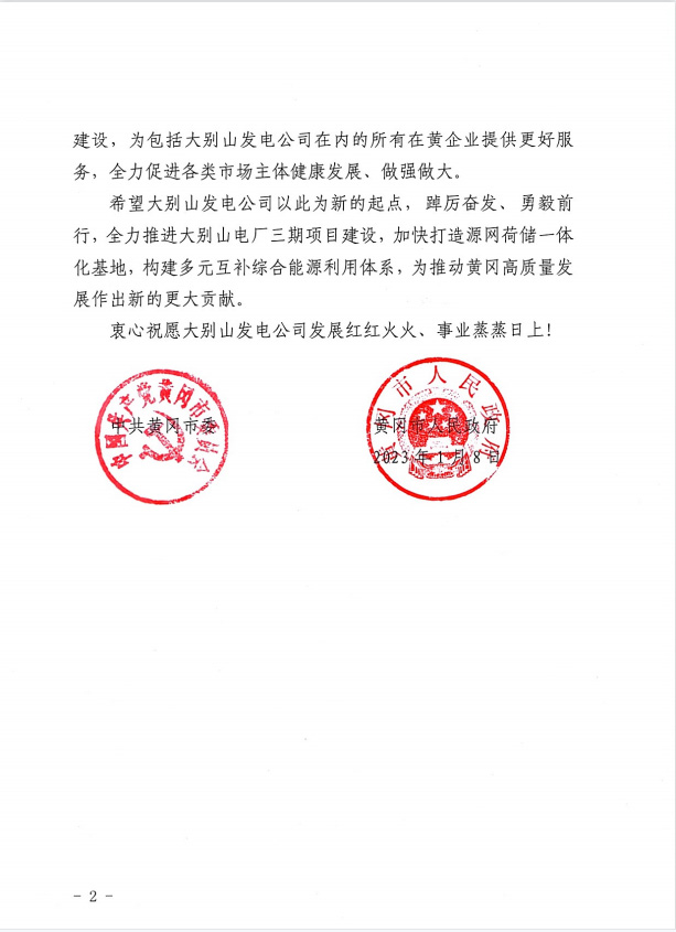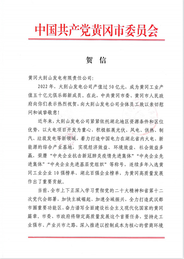 黃岡大別山發(fā)電有限責(zé)任公司總經(jīng)理汪紅旭收到賀信后深情地說:“我們深刻感受到黃岡市委、市政府對我們企業(yè)的大力支持,也深刻感受到黃岡市委、市政府重視發(fā)展工業(yè)的決心,我們將以火電項目開發(fā)為重心,積極拓展光伏、風(fēng)電、供熱、制汽、垃圾發(fā)電等新能源領(lǐng)域,著力打造中國電力在湖北省內(nèi)火電、新能源的綜合產(chǎn)業(yè)基地。”